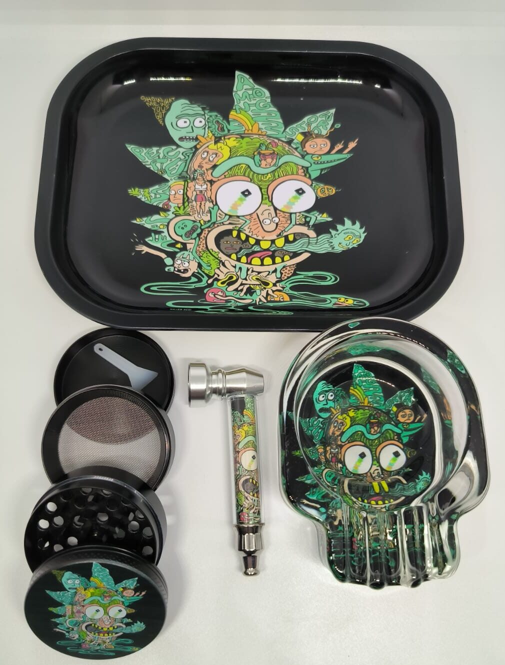 ESTE SET INCLUYE : BANDEJA METALICA, MOLEDOR 4 PISOS METALICOS, PIPA TAMBOR METAL Y CENICERO DE VIDRIO